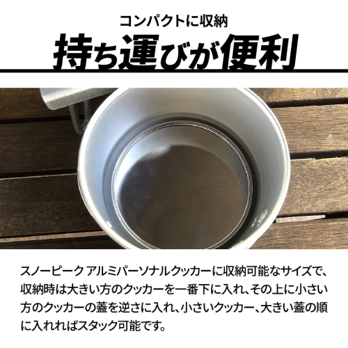 収納時は大きい方のクッカーの一番下に入れ、その上に小さい方のクッカーの蓋を逆さに入れ、小さいクッカー、大きい蓋の順に入れればスタック可能です。