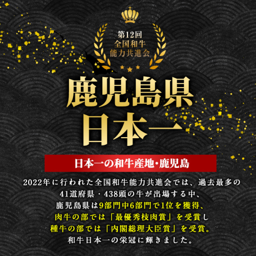 2022年10月に開催された「第12回全国和牛能力共進会」にて、鹿児島県は全9部門のうち6部門で1位(農林水産大臣賞)となり、また、「肉牛の部」では、最優秀枝肉賞も受賞し、「種牛の部」では内閣総理大臣賞を受賞する等、「和牛日本一」の栄冠に輝きました。