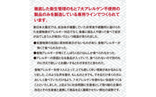 食物アレルギーを持つ人にとって、とても悲しく辛い現実があかるみになりました。このような声を聞き、もしものときでも、できるだけ多くの方においしく食べていただけるよう、7大アレルゲンを使わない缶詰をつくることといたしました。