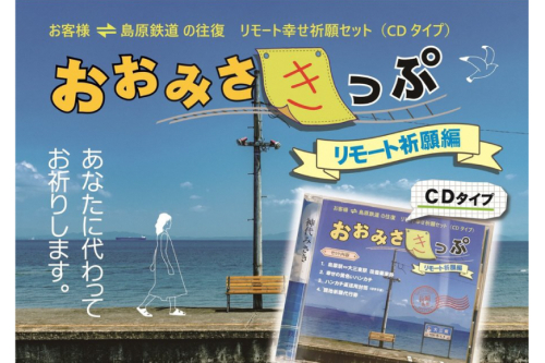 日本一海に近い駅と言われる島原鉄道の大三東駅(おおみさきえき)。 黄色いハンカチで幸せ祈願ができる駅として、これまでたくさんの人々が黄色いハンカチに願い事を書いて、幸せを願ってきました。 しかしながら、遠方の方は大三東駅に行きたくても行けないという方も多いのではないかと思います。 そこで、大三東駅を直接訪れなくても、ご自宅から黄色いハンカチで幸せ祈願ができるリモート幸せ祈願セットを作りました。 こちらの商品は、お客様が願い事などを書いたハンカチを島原鉄道へ送っていただき、島原鉄道がお客様の代わりに大三東駅へ出向き、幸せを祈願するというものです。 セット内容は、島原駅⇔大三東駅の往復乗車券、黄色いハンカチ、ハンカチ返送用封筒(切手不要)、大三東駅現地祈願代行券です。 これらはCDケースに入っており、ケースを開いて乗車券をセットして飾ることができます。もちろん乗車券は実際に使用することもできますので、いつかご乗車いただける日をお待ちしております。 <島原鉄道株式会社>