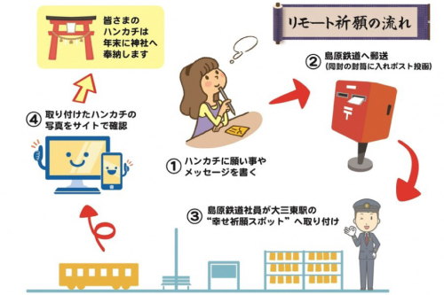 こちらの商品は、お客様が願い事などを書いたハンカチを島原鉄道へ送っていただき、島原鉄道がお客様の代わりに大三東駅へ出向き、幸せを祈願するというものです。