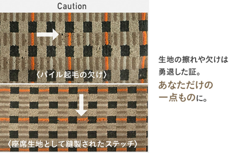 実際に東海道新幹線N700系typeAのグリーン車で使われていたモケット生地を採用。座席数が少ないため、1車体の新幹線に対して約15%しかない貴重な生地です。廃棄されるはずだった生地を洗浄後、再利用できる部分を選び、国内で丁寧に縫製しています。
