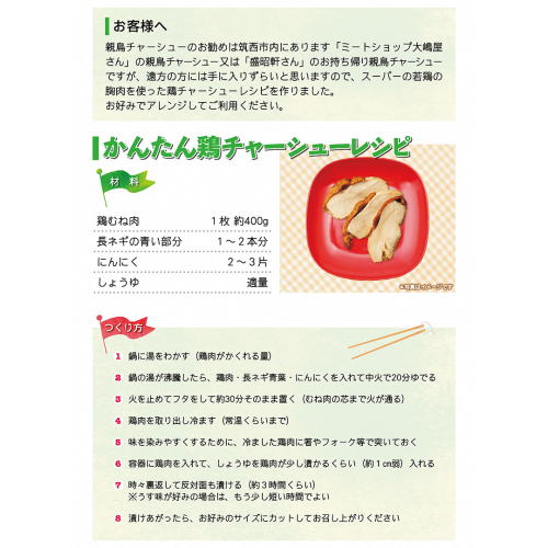 親鶏チャーシューのおすすめは、ミートショップ大嶋屋さんの親鳥チャーシューですが、遠方にお住まいでなかなか手に入りにくい方は、若鶏を使ったかんたん鶏チャーシューレシピを作りましたので、参考に作ってみてください。