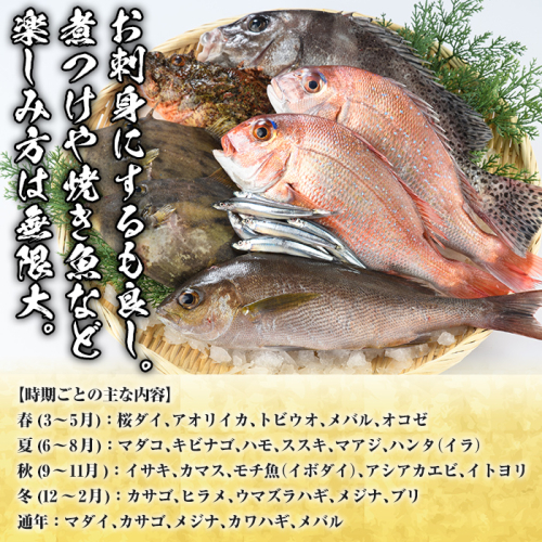 旬の天然鮮魚詰め合わせをご用意します!天然物なので何が届くかはお楽しみ! 東シナ海に面した鹿児島県阿久根市から、旬の天然鮮魚詰め合わせをご用意します! 天然物なので何が届くかはお楽しみ! 鹿児島の広大な海で育てられた新鮮な鮮魚を、魚のプロが季節に合わせて厳選し、丁寧に下処理を施してお届けします。 お刺身にするも良し。煮つけや焼き魚など楽しみ方は無限大です。 【時期ごとの主な内容】 春(3~5月):桜ダイ、アオリイカ、トビウオ、メバル、オコゼ 夏(6~8月):マダコ、キビナゴ、ハモ、ススキ、マアジ、ハンタ(イラ) 秋(9~11月):イサキ、カマス、モチ魚(イボダイ)、アシアカエビ、イトヨリ 冬(12~2月):カサゴ、ヒラメ、ウマズラハギ、メジナ、ブリ 通年:マダイ、カサゴ、メジナ、カワハギ、メバル 地産理由:阿久根市及び近隣の市町村近海で水揚げされた、天然鮮魚を100%使用し、製品化に係るすべての工程を阿久根市内の加工場において行っているため。(魚種は時期ごとで水揚げされる鮮魚に変更する) 市内で行っている加工:魚の仕入れ・選定、洗浄、鱗の除去、内臓・不純物等の除去、真空パック包装