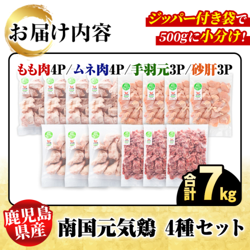 鹿児島県産!南国元気鶏 4種セット(合計7kg) 国産 九州産 鹿児島産 モモ肉 鶏モモ むね肉 胸肉 鶏ムネ 手羽元 砂肝 小分け Mセット【さるがく水産】akn028-21 1399967 - 鹿児島県阿久根市
