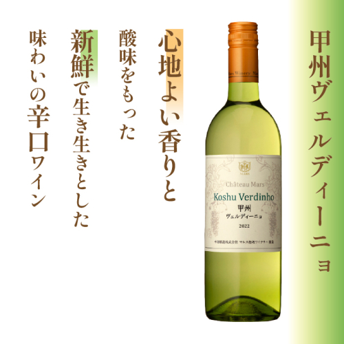 マルスワイナリーは、1960年、石和の地に設立以来、山梨の土壌が育む葡萄から高品質なワインの生産に尽力してきました。「甲州ヴェルディーニョ」は、これまで培ってきた経験のもと、各年号の年に甲府盆地で収穫された適熟甲州葡萄から、フリーランジュースのみを用いて低温発酵を行い瓶詰めしたワインです。