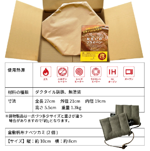 この返礼品は、おもいのフライパン20cmと組み合わせて使える「おもいのマルチパン20cm」と、伝統を紡ぎ希少なシャトル織機で織り上げられた「倉敷帆布のナベツカミ」のセットです。