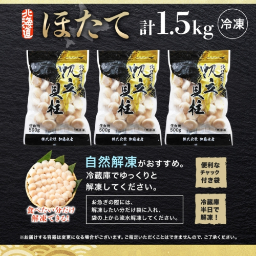3316. ホタテ 貝柱 500g 3個 北海道産 ホタテ貝柱 500g 3個 ほたて 帆立 玉冷 貝柱 生食 海鮮 貝 魚介 刺身 寿司 人気 お取り寄せ グルメ 送料無料 北海道 弟子屈町