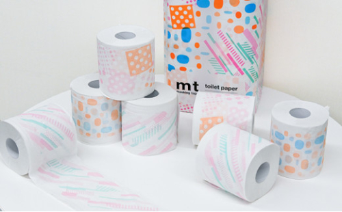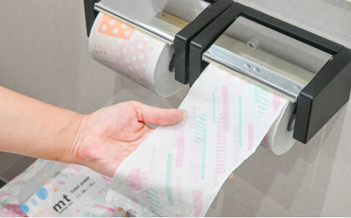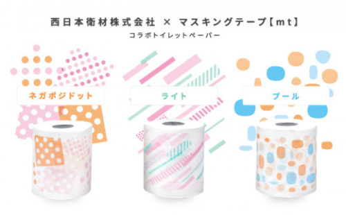 西日本衛材では、【mt】の定番柄である「ネガポジドット」「ライト」「プール」の3種類をトイレットペーパー向けにアレンジしました。今までありそうでなかったあたらしいプリント柄がトイレ空間を彩ります。