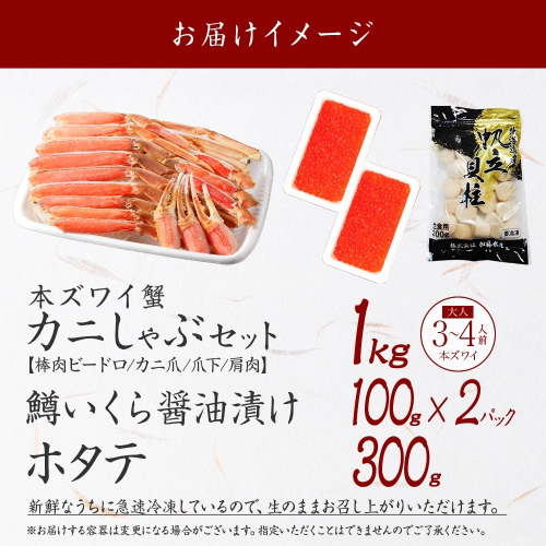 - 3623. ズワイ蟹しゃぶ1kg 鱒いくら醤油漬け100g×2 ホタテ300g 3種 セット カニ かに 蟹 鱒 いくら イクラ 帆立 ほたて お取り寄せ 送料無料 北海道 弟子屈町