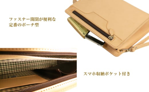 - スマホ収納ポケット付きのヌメ革メンズセカンドポーチ「テレポーチ・ヌメ革仕様」
