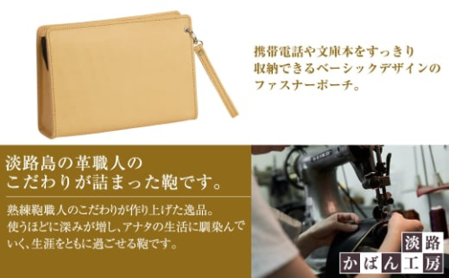 淡路かばん工房の熟練職人が手掛けたヌメ革ポーチは、オーダーメイド技術を駆使した高品質な製品。日本製の安心感と50年の歴史が誇る確かな技術力を感じてください。