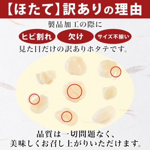 製品加工の際にヒビ割れ、欠け、サイズ不揃いになった帆立です。