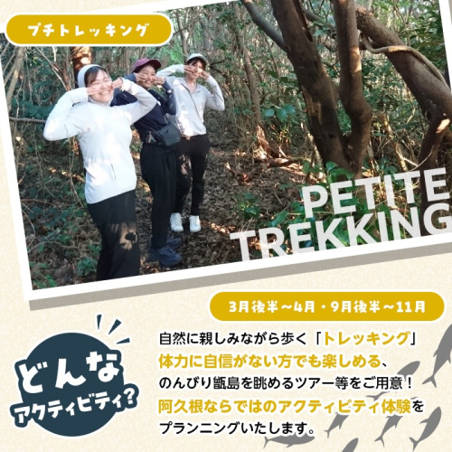 阿久根の自然を満喫できるツアーを御提供! 鹿児島県の北薩地域や阿久根市をメインに、山や海や川でのアクテビティを提供するアウトドアアクティビティツアー会社『パズル』から、阿久根の自然を満喫できるツアーを御提供! マウンテンバイクで阿久根市佐潟地区をのんびり回り、秘境を目指したプチトレッキングを楽しめる、パズルオリジナルツアーです。 ガイドと一緒に、一日かけてゆっくり楽しめるので、体力に自信のない方も安心して御参加いただけます。 阿久根の自然だからこそ味わえる、特別な体験をお楽しみください! 【注意事項】 入金確認後、チケットをお送りいたします。 ※ご予約はチケットに記載の電話番号へ御連絡ください。 ※チケットの有効期限は発行から2年間です。 ※春または秋(3月後半~4月・9月後半~11月)の期間限定実施となっております。 ※マウンテンバイクの仕様上、身長145cm以上の方が対象となります。 地産理由:阿久根市内で提供される役務のため