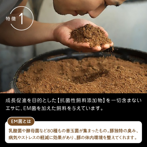 延岡よっとんとは、EM菌(善玉菌)をエサや寝床に使うことで、豚の腸内環境や農場全体の微生物環境を整え、健康的に育てた昔ながら味を目指した豚肉です。