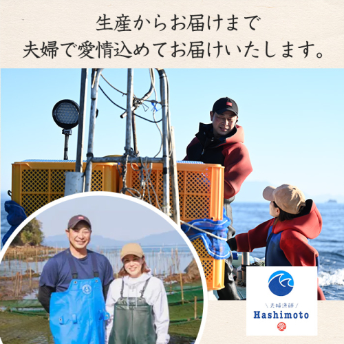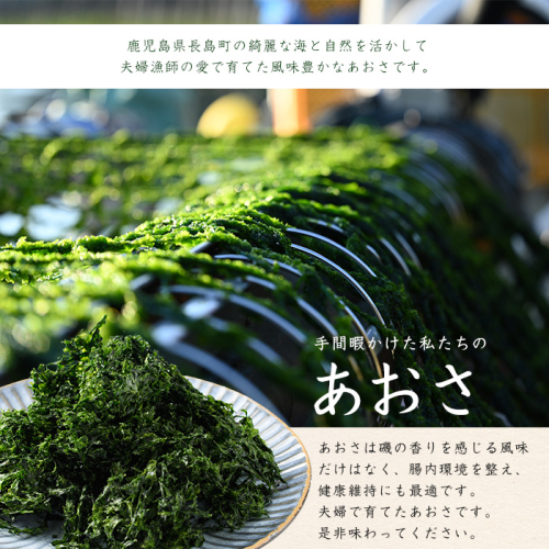 私達は家業として続く漁業を夫婦で営んでいます。日々変化する海と向き合いながら二人三脚で漁業をしています。長島周辺は潮流も早く天然の魚種も豊富で季節ごとに旬の魚が獲れます。あおさの漁場は自然豊かで土壌から流れ出るミネラルを多く含んだ所で養殖をしています。そんな綺麗な海で育てられた『あおさ』を知ってもらいたいと思い、あおさを楽しめる商品を考えました。