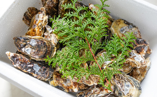 室津は山からの栄養が豊富で、通常種付けから出荷まで2〜3年かかると言われている真牡蠣の養殖ですが、「室津牡蠣」はおよそ1年。走りの時期は少し小ぶりですが、旬から名残りと時期が進むにつれて身も貝殻も大きく育ちます。ぷるんとやわらかい身の中には弾けそうなほどうま味がびっしり。短期間で育つ「一年牡蠣」の身は水の含有量が少ないので、調理しても縮まずふっくら。牡蠣フライや鍋にもおすすめです。