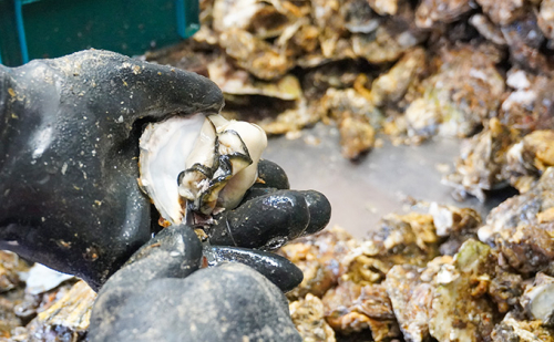 室津は山からの栄養が豊富で、通常種付けから出荷まで2〜3年かかると言われている真牡蠣の養殖ですが、「室津牡蠣」はおよそ1年。走りの時期は少し小ぶりですが、旬から名残りと時期が進むにつれて身も貝殻も大きく育ちます。ぷるんとやわらかい身の中には弾けそうなほどうま味がびっしり。短期間で育つ「一年牡蠣」の身は水の含有量が少ないので、調理しても縮まずふっくら。牡蠣フライや鍋にもおすすめです。