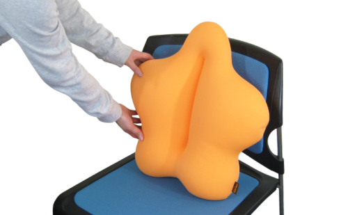 「CuCu(キュッキュッ)」は、イスと身体の隙間を埋め、身体を支える腰用クッションです。腰への負担を軽減できる理想の形を目指して設計しており、骨盤を立て、背骨を支え、さらに左右からウエストを包み込むように支えます。