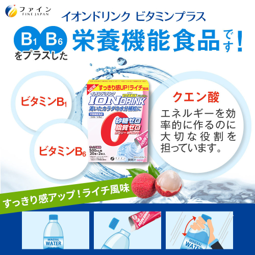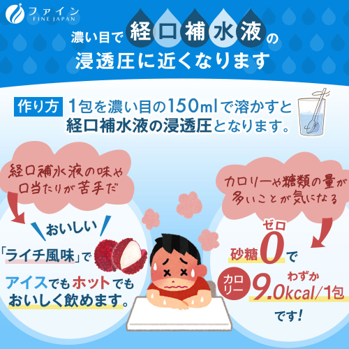 乾いたカラダに水分を速攻チャージ! 部活動などのスポーツ時、お風呂上がり、起床後など、ご家族皆さまの水分補給に! ●渇いたカラダの水分補給、汗で失った電解質の補給にご利用ください。 ●ビタミンB1、B6 をプラス。ゴクゴク飲めるライチ風味。 ●エネルギーを作るのに欠かせないクエン酸や、カルシウム・カリウム・マグネシウムなどのミネラル、ビタミンCも配合! ●500mLペットボトル22本分、計11リットル分です。使いやすいスティックタイプです。 ●すっきりした味わいで、アイスでもホットでもお召し上がりいただけます。 ●本品は浸透圧80 mosm/Lのハイポトニック飲料です。 水やお茶に含まれない電解質が含まれますので、水分吸収効率が良く、熱中時の対策にも。 そして、本品には砂糖が含まれていないため、砂糖を控えているという方にもおススメです。 ◇ファインは、自社研究開発(研究所FBRC)、健康食品GMP対応自社生産工場(兵庫県3工場)など一貫した国内供給体制で、あらゆるジャンルのニーズを調査し、皆様にご満足いただける商品を提案し続けます。