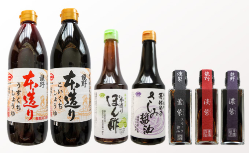 天正15年から醤油醸造で栄える龍野。この地で140年続く末廣醤油は、明治12年に創業し、数多くの醤油蔵と職人が腕を競い、切磋琢磨して守り続けた伝統の味を7種類、箱に詰めてお届けします。手土産やご進物にいかがでしょうか?