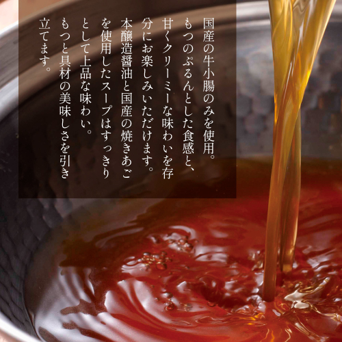 ぷるんととろける大ぶりの国産牛もつを人気店「博多もつ鍋やまや」の特製スープとともにお楽しみいただけるもつ鍋セットです。 本場博多のもつ鍋が味わえる店として、大人気の「博多もつ鍋やまや」。使用している国産牛もつは、ぷるんとした食感で、噛むほどに出てくる、甘くクリーミーな味わい。お好みでキャベツやニラ、シャキシャキのゴボウを加えることで、美味しさが一層引き立ちます。「あごだし醤油味」は、国産焼きあごを使用したうまだしと本醸造醤油をベースにすっきりとした甘口に仕上げました。
