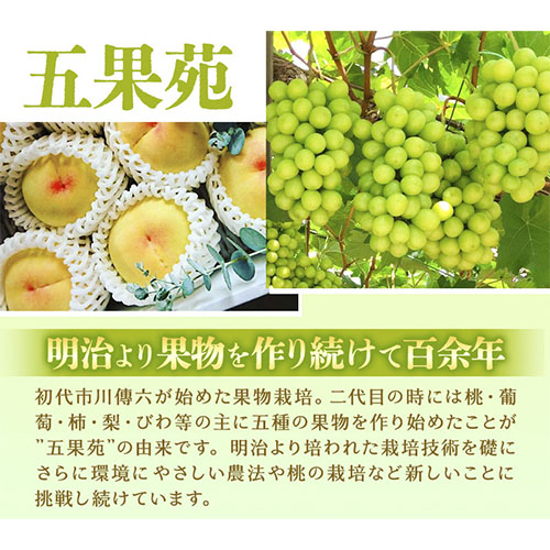 商品情報:奇跡の越冬ぶどう シャインマスカット 名称:シャインマスカット 産地:岡山県産 内容量:約1.2kg(1房約600g以上×2房) 賞味期限:お早めにお召し上がりください 配送方法:冷蔵便でお届けいたします。 提供元:五果苑 地場産品基準 告示第5条第8ハ号に適合 適合理由:岡山県 認定地域資源:桃