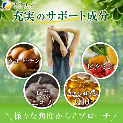 納豆のネバネバ部分は納豆キナーゼという酵素からなり、健康に重要です。 本品は納豆菌培養エキス末を加え、1日当たり納豆キナーゼ活性4000FU(製造時)摂取できるように設計しています。 さらに、サポート成分としてケルセチン、コエンザイムQ10、にんにくエキス末(リキニン(登録商標))、6種類のビタミンを加えた栄養機能食品(ビタミンB1)です。 ●健康診断の数値が気になる方、スムーズなめぐりを目指す実年世代の方の健康維持にお勧めします。 ●飲みやすいサプリメントのため、納豆の成分には興味があるが、納豆が苦手と言う方にもオススメです。 ●ビタミンB1の栄養機能食品です。 ビタミンB1は、炭水化物からのエネルギー産生と皮膚や粘膜の健康維持を助ける栄養素です。 ◇ファインは、自社研究開発(研究所FBRC)、健康食品GMP対応自社生産工場(兵庫県3工場)など一貫した国内供給体制で、あらゆるジャンルのニーズを調査し、皆様にご満足いただける商品を提案し続けます。 取扱事業者:(株)ファイン