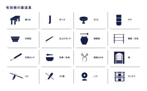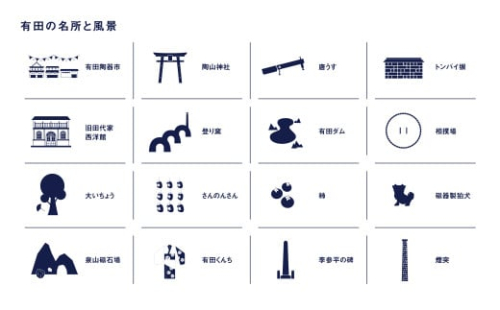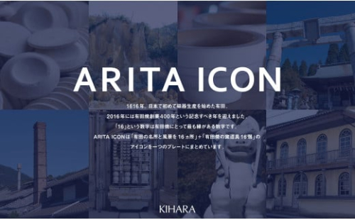 ARITA ICONは「有田の名所と風景を16ヵ所」+「有田焼の窯道具16個」のアイコンを一つのプレートにまとめています。