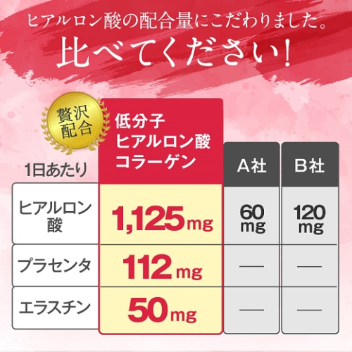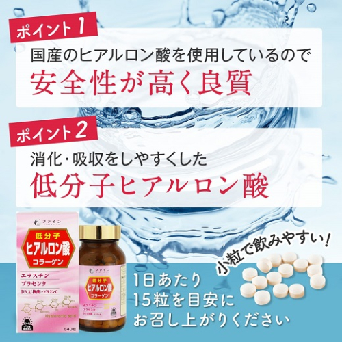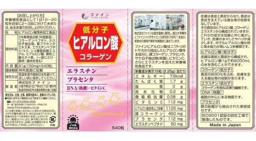◇ファインヒアルロン酸はニワトリのトサカから得られた低分子化したヒアルロン酸含有ムコ多糖類を主成分にコラーゲン、サケ白子抽出物(DNA)、プラセンタおよびビタミンC、更にコラーゲンを束ねる弾力繊維であるエラスチンを加えた栄養補助食品です。