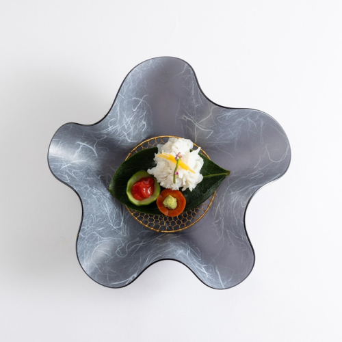 【説明】 黒を纏う 黒い和紙の趣と匠の技 アクリルを曲線で奏でる うつ和 それは世界にただひとつ 唯一無二  one and only うつ和は、一般的な樹脂食器とは異なり一つ一つ手曲げ加工した食器です。 和紙柄は伝統的な日本文化や美意識を象徴し、樹脂素材は現代的な軽量で耐久性のある素材です。 これらの要素が組み合わさることで、日本の伝統と現代の融合を表現した食器です。 細部にまで気配りがされた製品は、耐久性があり長く愛用することができます。 Premium Black このプレミアムブラックは、黒い和紙をイメージしています。 多くのレストランで使われている白いテーブルクロスに、うつ和がシックでモダンな表情で映えるように今回特別に開発した、NJ Styleのオリジナルブラックカラーです。 【うつ和シリーズ】 材質:アクリル樹脂 厚み:2mm 耐熱温度:80度 家庭用食洗器対応可 電子レンジ不可 割れにくい素材 食品衛生法対応 スタッキング可 【保存方法】 常温 【地場産品基準】 3号:原材料の仕入れ、裁断、面取り、加熱、成型、梱包まで全てを区域内で行うことにより、相応の付加価値が生じているもの。