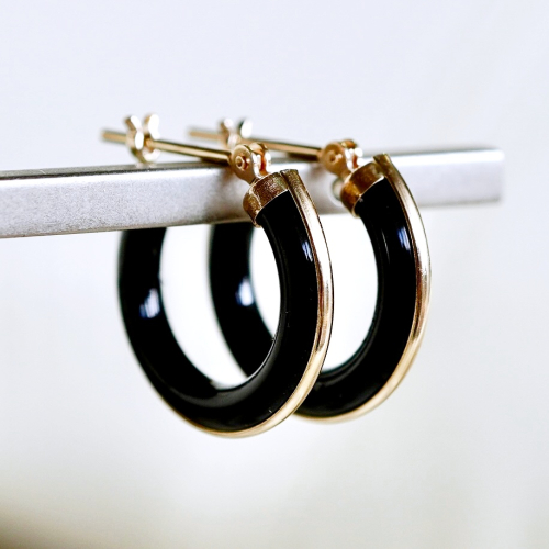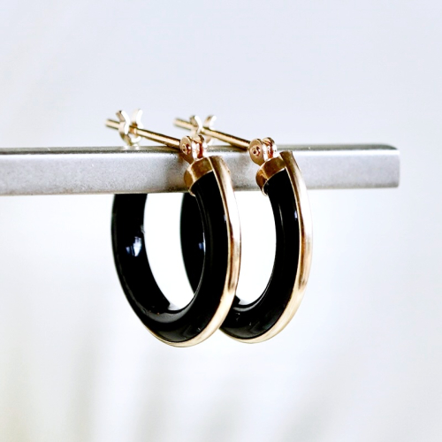 K10(10金)のオニキスのフープピアスです。 ブラックのオニキスにゴールドのラインが映え、クールな印象を感じます。 男女問わずスタイリッシュにお使いいただけるアイテムです。 ケースに入れ、リボンをかけてお届けいたします。