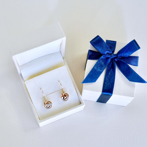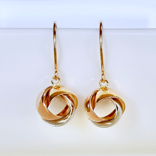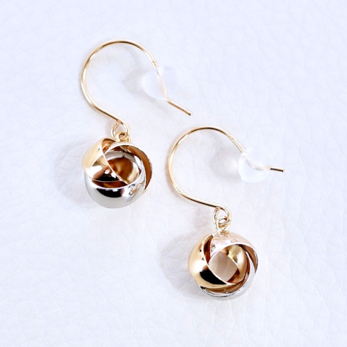3色のゴールドカラーが美しいピアスです。 3色が立体的に球状に組み立てられており、角度によって見え方が違うところがデザインのポイントです。 コロンと軽やかにオシャレさを演出します。 ケースに入れ、リボンをかけてお届けいたします。