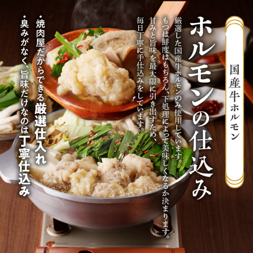 2021年6月7日東海テレビ「スイッチ!」で紹介されました。 愛知県産をはじめとする国産牛ホルモン(小腸)のみを使用しております。丁寧な下処理をすることでホルモンのぷりぷり感を味わっていただけます。研究を積み重ねたしょう油スープは、あご出汁をベースに鰹だしや数種の調味料を最高のバランスで調合し、「国産牛ホルモン」に合う絶品スープに仕上げております。 専門店の味をぜひご自宅で堪能していただけます。 ■地場産品基準 原材料の仕入れから製造加工までの全工程を区域内で行っている国産牛小腸、各種薬味、ちゃんぽん鍋(3号該当)に、区域外で製造されたもつ鍋スープをセットにして提供するもの。