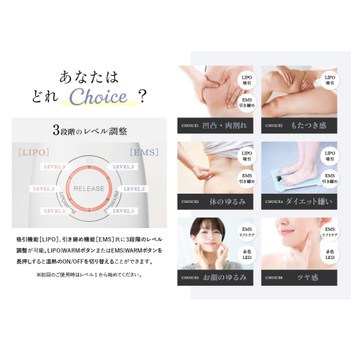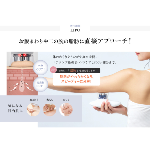 「Plus(プラス)」モデルでは、従来のLIPO(吸引)、EMS(筋肉刺激)、赤色LED(フォトケア)に温熱機能が追加され、効果がアップされています。