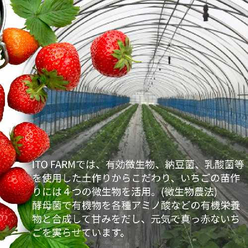 乳酸菌には殺菌力があり、耐病性をつけ酵母菌で有機物を各種アミノ酸などの有機栄養物に合成し甘みをだし、元気に真っ赤な苺を実らせてくれます。