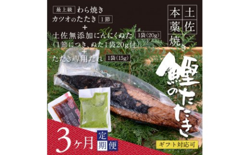- 〈かつおのたたき×1節(鰹の大きさには個体差があり、1節約320g~360g以上)、有機無添加土佐にんにくぬた 20ml×1袋、たたきのタレ15ml×1袋、おろしニンニク2g×1袋〉×3か月
