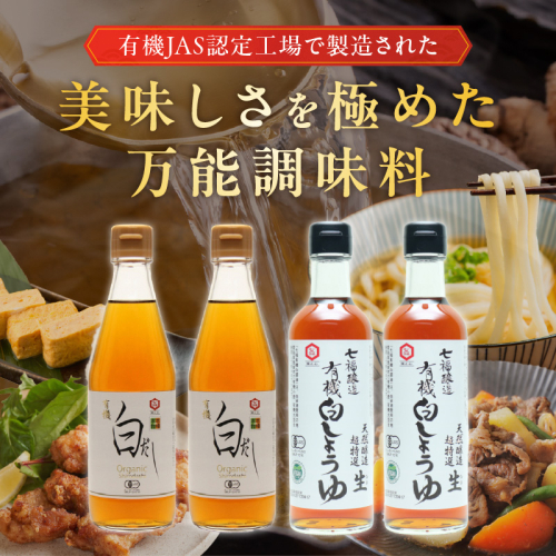 七福醸造の有機白だし・有機白しょうゆ 4本セット 厳選素材 万能 調味料 白醤油 白出汁 セット レシピ冊子付き 出汁 だし 醤油 しょうゆ 旨味 和食 煮物 卵料理 お吸い物 麺類 炒めもの 揚げ物 料理 ヴィーガン ビーガン vegan 認証 H001-090