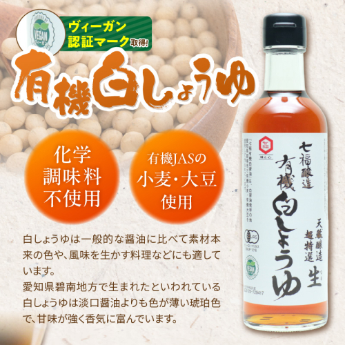 - 七福醸造の有機白だし・有機白しょうゆ 4本セット 厳選素材 万能 調味料 白醤油 白出汁 セット レシピ冊子付き 出汁 だし 醤油 しょうゆ 旨味 和食 煮物 卵料理 お吸い物 麺類 炒めもの 揚げ物 料理 ヴィーガン ビーガン vegan 認証 H001-090