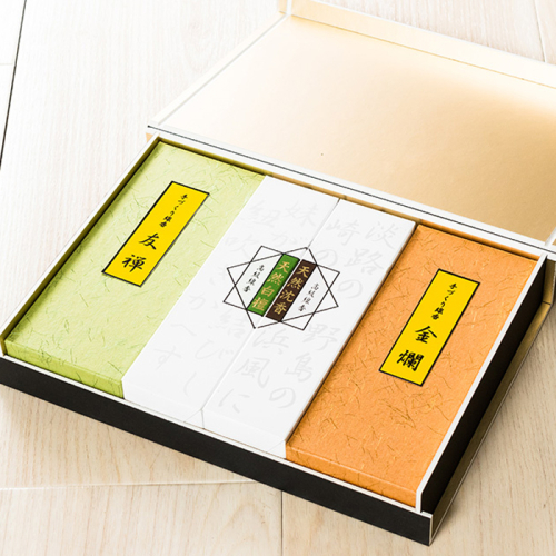 自然が生み出した貴重な香木「沈香」と「白檀」の天然の香りのお線香、天然白檀を基調とした甘さが多様に変化する「友禅(ゆうぜん)」、そして、天然香木を配合し秘伝調合により五味の香りを表現した「金爛(きんらん)」の4種類の詰合せです。