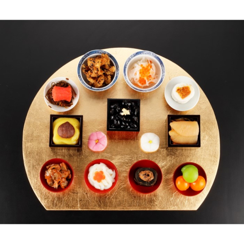 ロールケーキチョコバナナ/くるみのキャラメリゼ/筍旨煮/くわい柚子胡椒和え/金時人参/博多高野(海老)/博多高野(ほうれん草)/海老芋旨煮/陣笠椎茸(人参木耳)/蓮根旨煮/蓬麩/紅鮭昆布巻/干し柿クリームチーズ巻/スフレ風テリーヌ/紅白餅串/赤魚酒粕焼/鰆黄金焼/さつま芋レモン風味/若桃甘露煮/小鯛俵焼/子持昆布彩り和え/烏賊柚子和え/国産とこぶし旨煮/ふぐ皮明太子和え/小柱と烏賊の卵紅白和え/海老旨煮/金柑/葉わさび松前漬/北海道産数の子/寿昆布扇子/きのこと木耳の佃煮/博多焼チーズ風味/サーモン手毬/ぼら白子旨煮/牛肉笹包み/紅白市松蒲鉾/大学芋柚子風味/丹波産黒豆/塩レモンチキン/烏賊黄金焼/烏賊雲丹焼/鶏皮唐揚げ/鯖昆布巻/糸昆布甘酢炊/蛸梅紫蘇和え/鰊黄金和え/紅白なます/蟹風味蒲鉾土佐酢漬/梅酒玉/栗金団/焼栗ブランデー風味