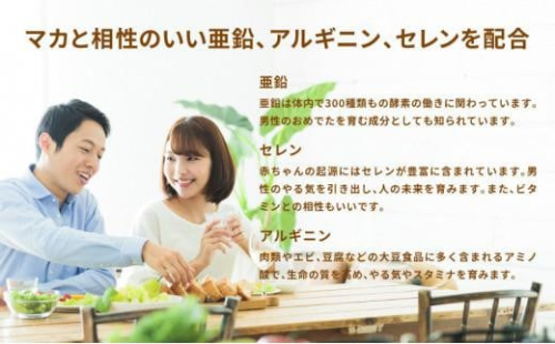 有機マカ末、4種のビタミン、3種のお疲れサポート成分(亜鉛・セレン・アルギニン)を配合したマカサプリメント。