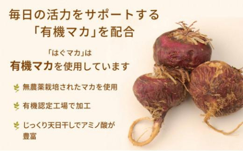 有機マカ末、4種のビタミン、3種のお疲れサポート成分(亜鉛・セレン・アルギニン)を配合したマカサプリメント。