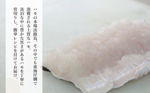 ハモの本場淡路島、その中でも東海岸側で漁獲される上質なハモ。 淡泊な中に豊かな旨さがあるハモを丁寧に骨切りし、簡単レシピを付けてお届け。 付属の特製タレで淡路名物ハモすき鍋・天婦羅・湯引きにお吸い物、ハモを余す事なく堪能して頂けます。 ※冷蔵配送をご希望の場合は、備考欄にその旨と配達希望日時を記入してください。  (例)冷蔵配送希望 〇月〇日 18時~20時 ※申込日の14日後~ ※8/10~8/20のお届けは指定できません。ご了承ください。 ※消費期限が短いため(発送日より4日間) ※ご希望に添えない場合は出荷場(株式会社由海 0799-75-2222)よりご連絡致します。 ※記載がない場合は冷凍にて配送致します。 株式会社由海(0799-75-2222) ・返礼品の配送にあたり、事業者などより連絡する場合がありますので、必ず日中連絡がつく電話番号、またはメールアドレスをご登録ください。 ・寄附への御礼の品です。ご不在や送付先住所の誤り等により、返礼品がお届けできない場合、再送は致しかねます。あらかじめご了承下さい。