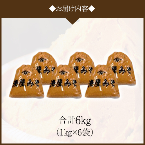材料の大豆にこだわり、良質な地下水を使用した、まろやかで糀の甘味が引き立つ味噌です。糀をふんだんに使用し、100余年にわたり受け継がれた秘伝の醸造法で手間暇かけて仕込んでおります。 他の味噌の追随を許さない、味の豊かさをお楽しみください。 1kg袋を6個セットでお届けいたします。 【注意事項】 短冊熨斗の対応となります。 ※名入れ不可 別送(お申し込み情報と返礼品配送先が異なる)でお申し込みの場合、 配送伝票のご依頼主欄にはお申し込み情報(氏名・住所等)が記載されます。 ※「ふるさと納税」の記載はございません 返礼品の出荷時にお申し込み時のメールアドレスへ出荷完了通知をお送りしております。 ご不在で持ち戻りになった場合、再配達はいたしかねますので予めご了承ください。 ※クール便対象 配送できない地域がございます※ ・伊豆諸島:青ヶ島村(青ヶ島)・利島村(利島)・御蔵島村(御蔵島)・式根島・小笠原諸島:小笠原村(父島・母島・硫黄島・南鳥島など) ※お受け取り後は、すぐに状態をご確認ください。※ 万全を期して返礼品をお届けしていますが、万が一、不備等があった場合は返礼品受け取り時に、写真(画像)を添付のうえ電子メールにてご連絡ください。 日数が経ったものに関しましては対応いたしかねますので、ご了承ください。 また、不備等があった返礼品は食べたり、飲んだり、捨てたりせず、対応が決まるまで保管をお願いします。保管されてない場合、代替品での対応等が難しい場合がございます。 ご連絡先:sakuragawa@furusato-g.com 【賞味期限】 製造から半年 【アレルギー】 大豆 【事業者名】 有限会社湊屋味噌醸造所