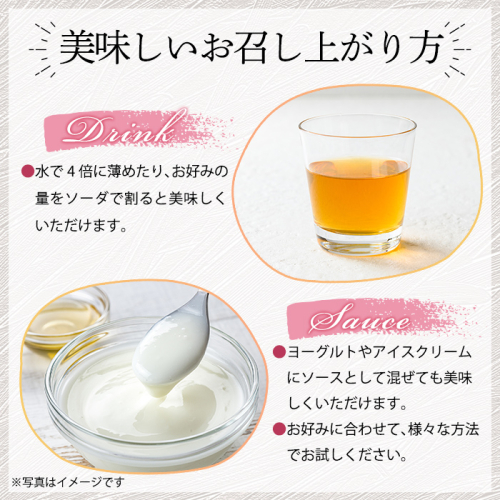 水で4倍に薄めたり、お好みの量をソーダで割ると美味しくいただけます。牛乳やヨーグルトと混ぜても美味しく、料理の隠し味にもぴったりです。
