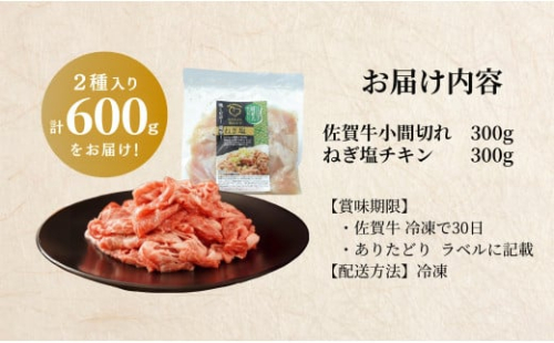 - 牛肉&鶏肉 佐賀の地元産お肉を2種楽しめる 佐賀牛小間切れ ありたどり塩ネギ セット 各300g 計600g 肉 佐賀牛 牛肉 おすすめ N13-3
