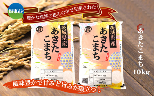 坂東市の豊かな自然の恵みの中で生産された「あきたこまち」です。 「あきたこまち」は、輝くツヤと透明感があり、香りが高く、もちもちとした食感です。冷めてもごはんが硬くなりにくく、おいしさが長持ちします。 本返礼品の主要な部分は、坂東市にて生産、製造または加工したものが占めております。