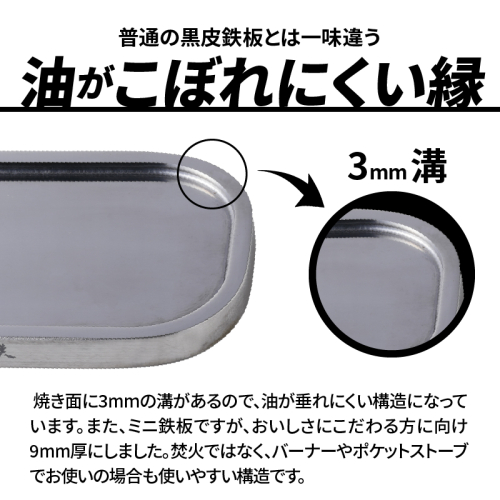 鉄板の魅力はフライパンやスキレットに比べたら取っ手がない事やその薄い収納性。 溝がない鉄板はもちろん、少し縁が反り上がってるだけの鉄板では液ダレは防げません。 焼き面に3mmの溝があるので、油が垂れにくい構造になっています。焚火ではなく、バーナーやポケットストーブでお使いの場合も使いやすい構造です。