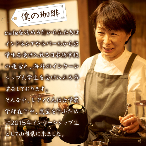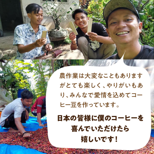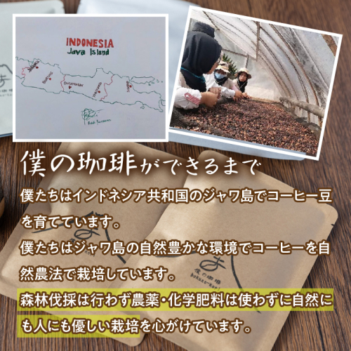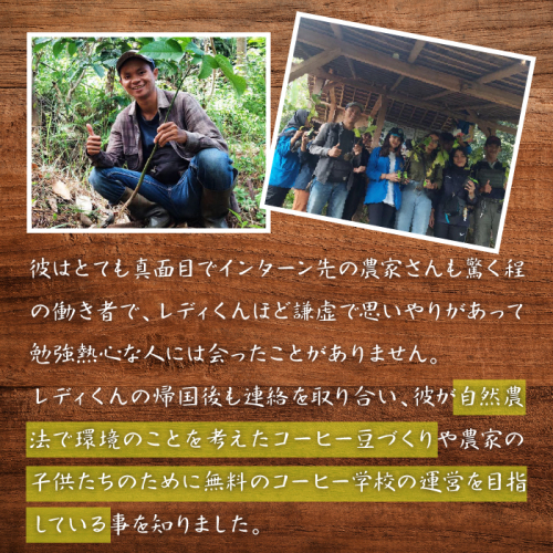 弊社グループ日本語学校(@インドネシアジャワ島)から山梨県にインターン生として来日した大学生が卒業後にコーヒー農園を設立、自然栽培で育てたコーヒーを国内では当店のみに直送、当店で焙煎した4種類を詰め合わせしました。
